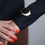 The sleeve has an opening so the watch can pass through without having to pull up the sleeve.
